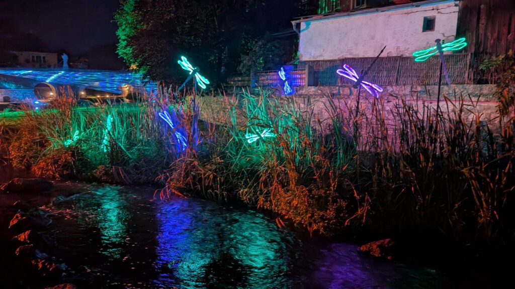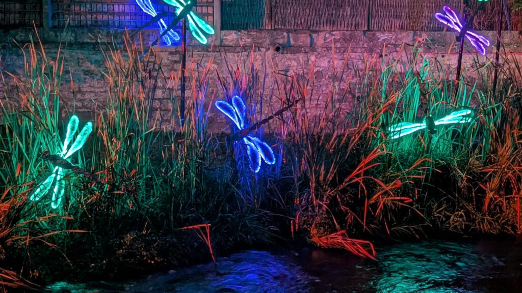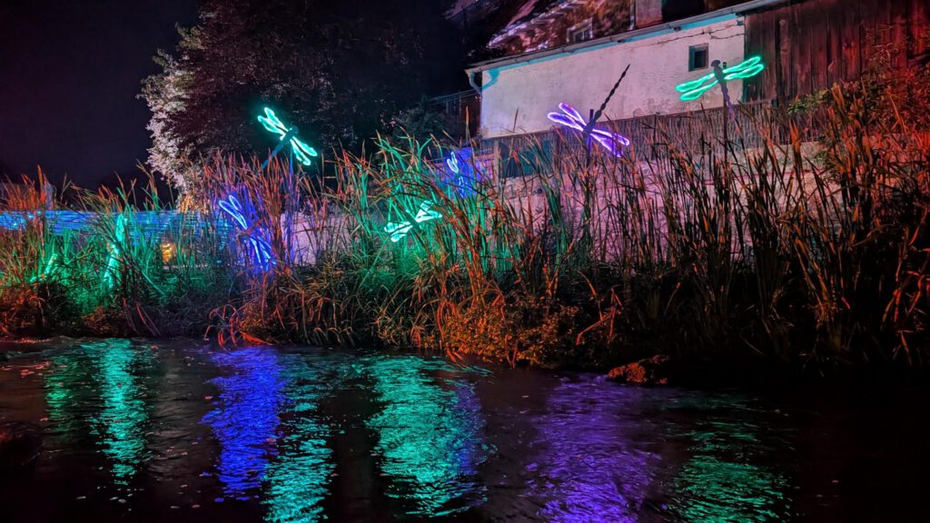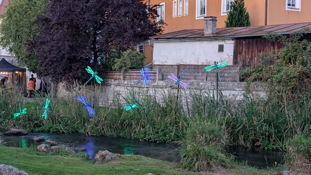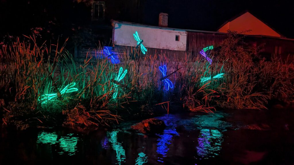 Neun anmutigen Libellen, die entlang des Ufers zu schweben schienen. Jedes Lichtkunstwerk war wie ein zarter Bote aus Licht und Fantasie, der die Besucher verzauberte.